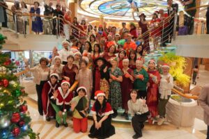 Since the ship was calling at Honolulu on Christmas Day, onboard Christmas events were held a little early. The atrium was beautifully decorated with a large Christmas tree and festive holiday colors, and a Christmas-themed fashion show took place. Participants dressed in their special outfits walked gracefully down the runway, and everyone enjoyed a warm, colorful, and heartwarming moment as each person’s unique style shone through.