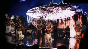 Members of the Rapa Nui Folk Dance Group, a troupe of local musicians and dancers, came onboard as Peace Boat was anchored off the coast of Easter Island. Their Rapa Nui Performance Stage showcased traditional instruments and dances handed down through generations on the island. The members delivered rhythmic music and powerful yet graceful dances, captivating everyone on board. Experiencing the music and dance of Rapa Nui was a rare change that deepened our appreciation for the rich cultural heritage that continues to thrive on this island.