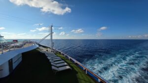 On this beautifully clear day, a breathtaking panorama stretched endlessly from the ship’s deck. Lounge chairs face the open sea along the aft deck, inviting you to recline and relax to the gentle rhythm of the waves. With the stunning scenery of sea and sky always side by side, cruise life becomes more than just a means of travel—it is a truly luxurious experience of time itself.