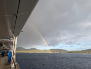 The Pacific World sailed westward across the Pacific Ocean and anchored off Easter Island — a “solitary island in the vast ocean,” surrounded by some 2,000 kilometers of open sea. Because the island has no port large enough to accommodate cruise ships, passengers transfer to small boats to go ashore. From the ship’s deck, we could see a rainbow arching over the island — a mystical sight. Easter Island is filled with wonders, from the famous Moai statues to countless other mysteries. We can’t wait to set foot on its shores!